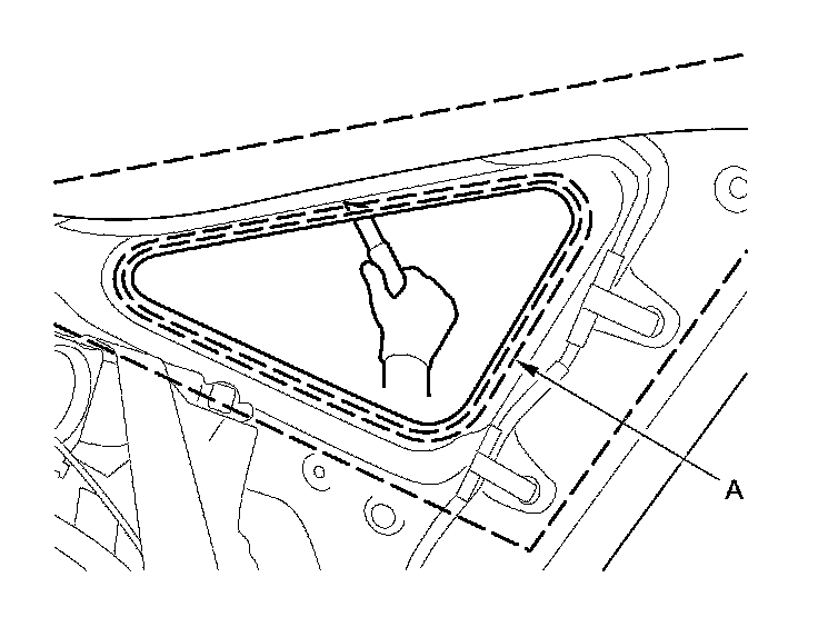 4. From inside the vehicle, cut through the adhesive (A) of the quarter glass with a utility knife.