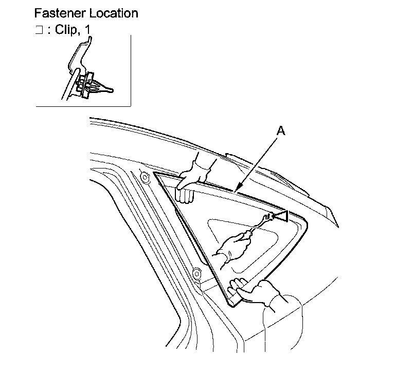 5. With an assistant holding the quarter glass (A), detach the clip with a clip remover from inside the vehicle, then carefully remove the quarter glass.