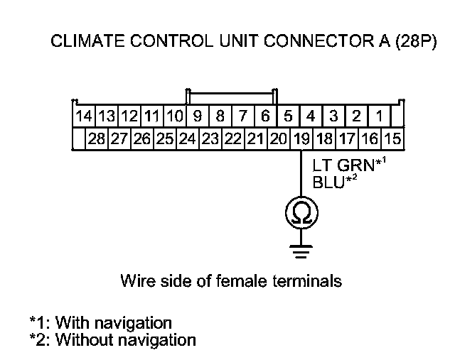 8. Check for continuity between climate control unit connector A (28P) terminal No. 19 and body ground.