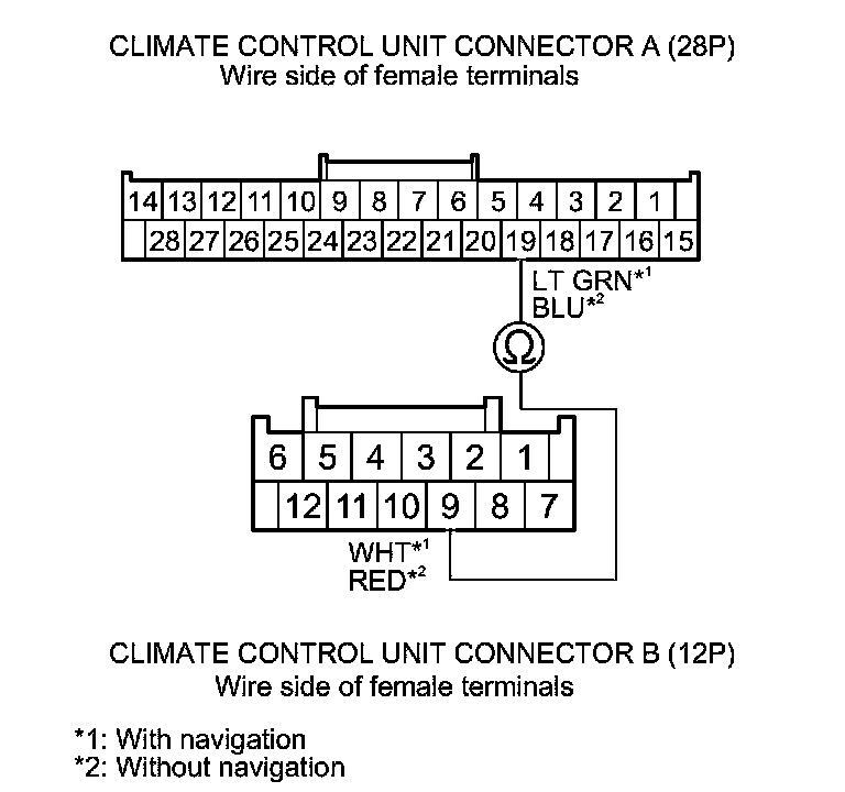 9. Check for continuity between climate control unit connector A (28P) terminal No. 19 and climate control unit connector B (12P) terminal No. 9.