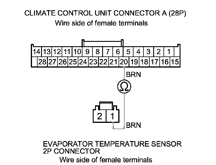 7. Check for continuity between climate control unit connector A (28P) terminal No. 20 and evaporator temperature sensor 2P connector terminal No. 1.