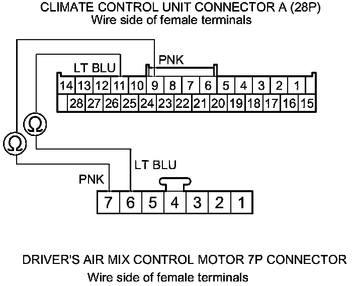9. Check for continuity between the following terminals of climate control unit connector A (28P) and the driver's air mix control motor 7P connector.