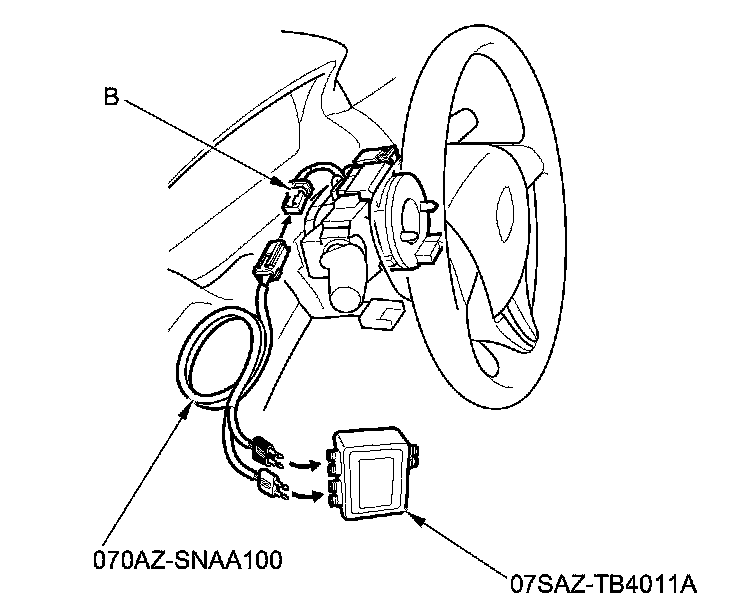 24. Disconnect the SRS inflator simulator from SRS simulator lead J. Do not disconnect SRS simulator lead J from cable reel connector B (4P) on the dashboard wire harness.