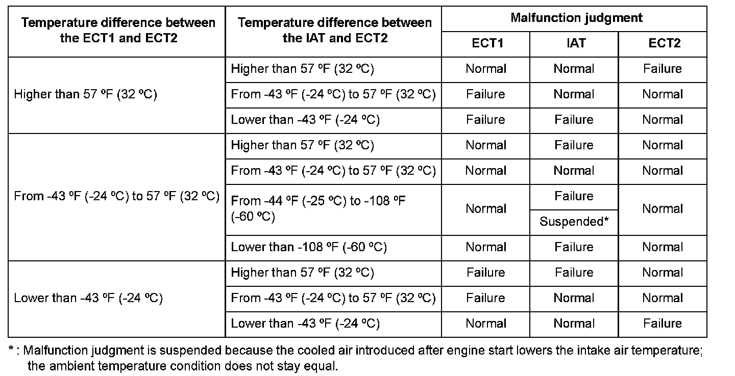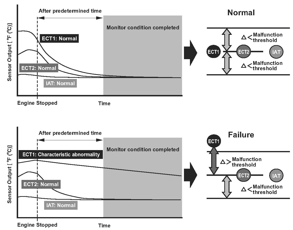 Two engine coolant temperature (ECT) sensors and one intake air temperature (IAT) sensor are used by the powertrain control module (PCM). When the engine is stopped and enough time has passed, the temperature of the engine will equalize to the ambient temperature. ECT sensor 1 and IAT sensor are compared to ECT sensor 2, and if an inappropriate temperature is read, the PCM detects a malfunction in the corresponding sensor and stores a DTC.