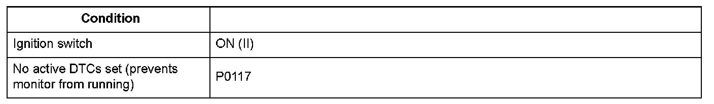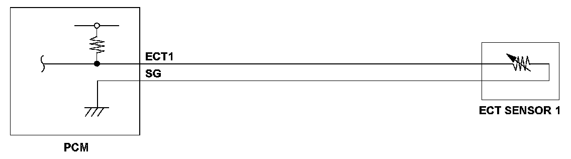 Engine coolant temperature (ECT) sensor 1 is used for air/fuel ratio feedback control, ignition timing control, idle speed control, and other functions. The ECT sensor 1 resistance varies depending on the engine coolant temperature. As the engine coolant cools, the ECT sensor 1 resistance increases, and the powertrain control module (PCM) detects a high signal voltage. As the engine coolant warms, the ECT sensor 1 resistance decreases, and the PCM detects a low signal voltage. If the ECT sensor 1 output voltage is a set value when the engine coolant temperature is low, the PCM detects a malfunction and stores a DTC.