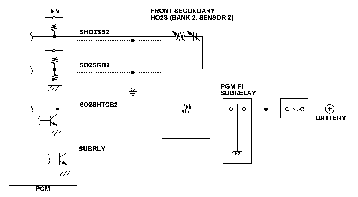 The front secondary heated oxygen sensor (secondary HO2S (bank 2, sensor 2)) detects the oxygen density in the exhaust gas and converts it into electrical signals. If the front secondary HO2S output voltage is a specified value for a set time, the powertrain control module (PCM) detects a malfunction and stores a DTC.