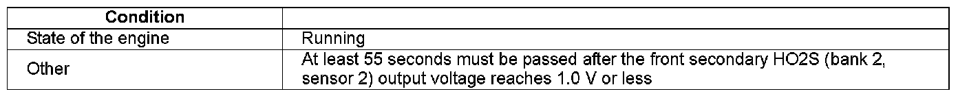The front secondary HO2S (bank 2, sensor 2) output voltage is 0.12 V or less for at least 5 seconds.