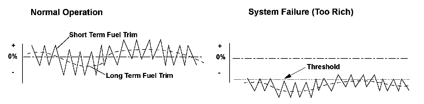 The powertrain control module (PCM) detects the oxygen content in the exhaust gas from the front air/fuel ratio (A/F) sensor bank 2, sensor 1) signal voltage, and it uses fuel feedback control to maintain the optimal air/fuel ratio. The air/fuel ratio coefficient for correcting the amount of injected fuel is the short term fuel trim. The PCM varies short term fuel trim continuously to keep the air/fuel ratio close to the stoichiometric ratio for all driving conditions. Long term fuel trim is computed from short term fuel trim and is used to regulate long term deviation from the stoichiometric air/fuel ratio, which occurs when fuel metering components deteriorate with age or system failures occur. In addition, long term fuel trim is stored in the PCM memory and is used to determine when fuel metering components malfunction. When long term fuel trim is higher than normal, which is about 1.0 (0 %), the amount of injected fuel must be increased, and when lower than normal, it must be decreased. If long term fuel trim is lower than normal (too rich), the PCM detects a malfunction in the fuel metering components and stores a DTC.