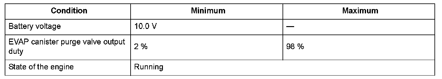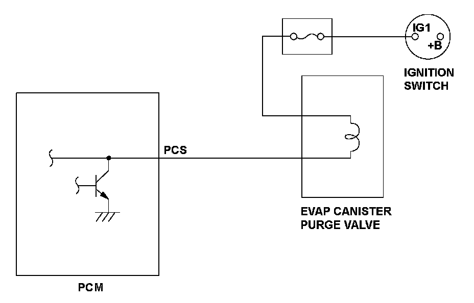 The evaporative emission (EVAP) canister purge valve is attached to the vacuum port between the intake manifold and the EVAP canister. The powertrain control module (PCM) does not turn on the EVAP canister purge valve when the engine coolant temperature is less than a specified value. The PCM adjusts the amount of fuel vapor sent to the engine by controlling the EVAP canister purge valve duty cycle. When the return signal does not change according to the EVAP canister purge valve output for a set time, the PCM detects a malfunction and stores a DTC.