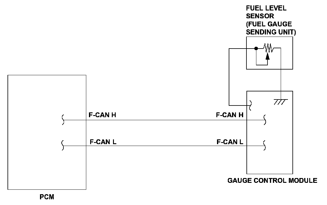 The fuel level sensor (fuel gauge sending unit) is incorporated into the fuel pump and installed in the fuel tank. Using a built-in potentiometer and float, it converts the movement of the float to electrical signals as an output that corresponds to fuel level variations in the fuel tank. The fuel level, which is indicated by the gauge control module, is sent to the powertrain control module (PCM) via the controller area network (CAN). If the PCM detects a signal from the fuel level sensor (fuel gauge sending unit) above a predetermined value for a set time, it detects a malfunction and stores a DTC.