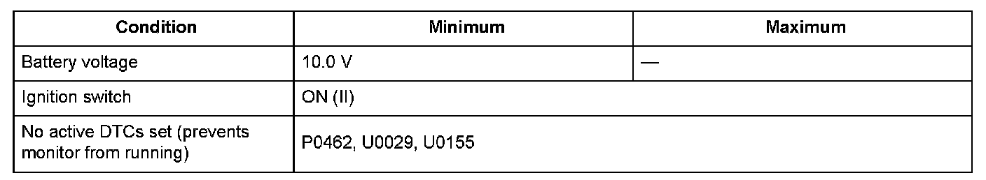 The fuel level sensor (fuel gauge sending unit) output voltage is 4.92 V or more for at least 5 seconds.
