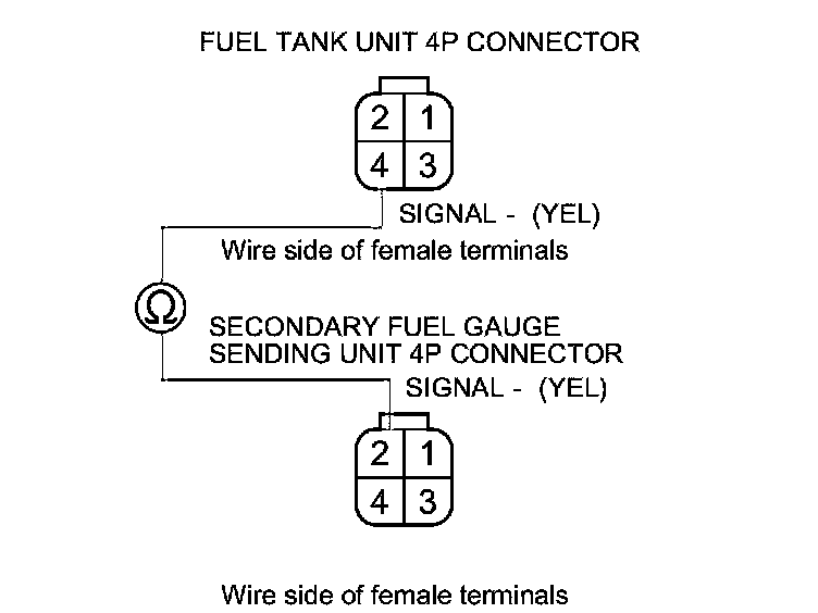 10. Check for continuity between fuel tank unit 4P connector terminal No. 4 and secondary fuel gauge sending unit 4P connector terminal No. 2.