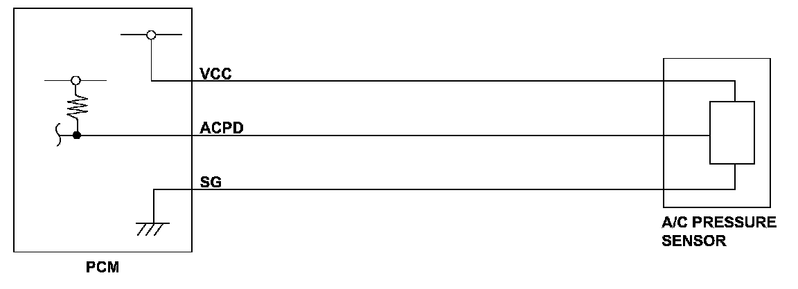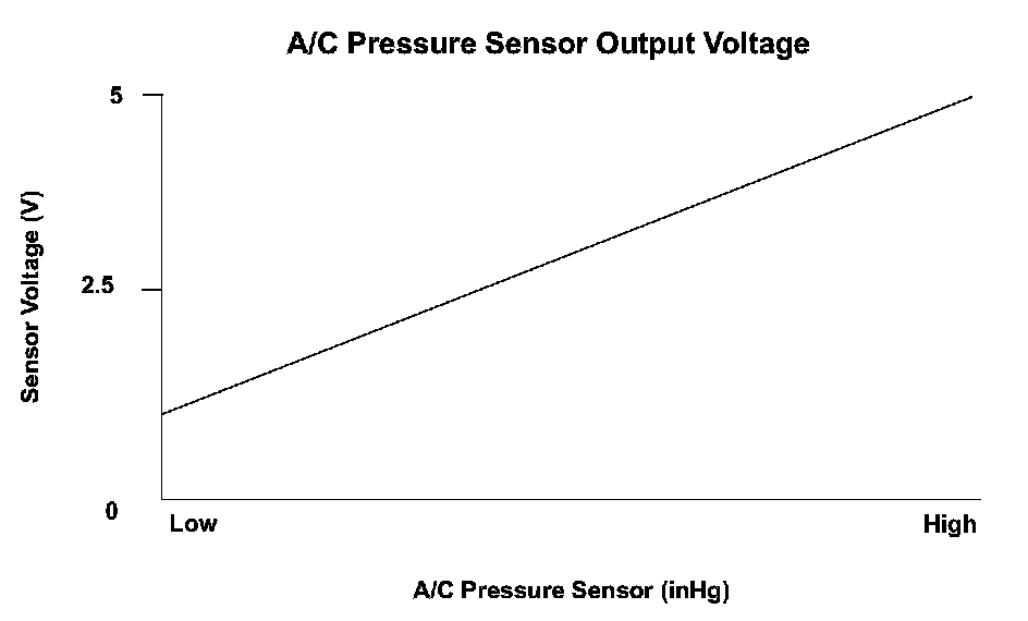 The A/C pressure sensor measures the change in the pressure of the air conditioning refrigerant. The signal from the A/C pressure sensor is low voltage at low pressure (when the air conditioning load is low) and high voltage at high pressure (when the air conditioning load is high). The powertrain control module (PCM) compares the expected voltage to the A/C pressure sensor output voltage. When the A/C pressure sensor output voltage is higher than the expected voltage for a set time, the PCM detects a malfunction and stores a DTC.