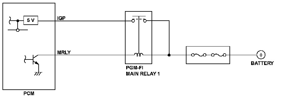 If there is a short to ground in the harness between the powertrain control module (PCM) and PGM-FI main relay 1, PGM-FI main relay 1 stays ON even if the ignition switch is turned to LOCK (0), and the PCM remains active. However, the engine is not running because power for the gauges, the ignition, and the fuel pump is turned OFF by the ignition switch. When the PCM operates for a set time after the ignition switch is turned to LOCK (0), it detects a malfunction and stores a DTC.