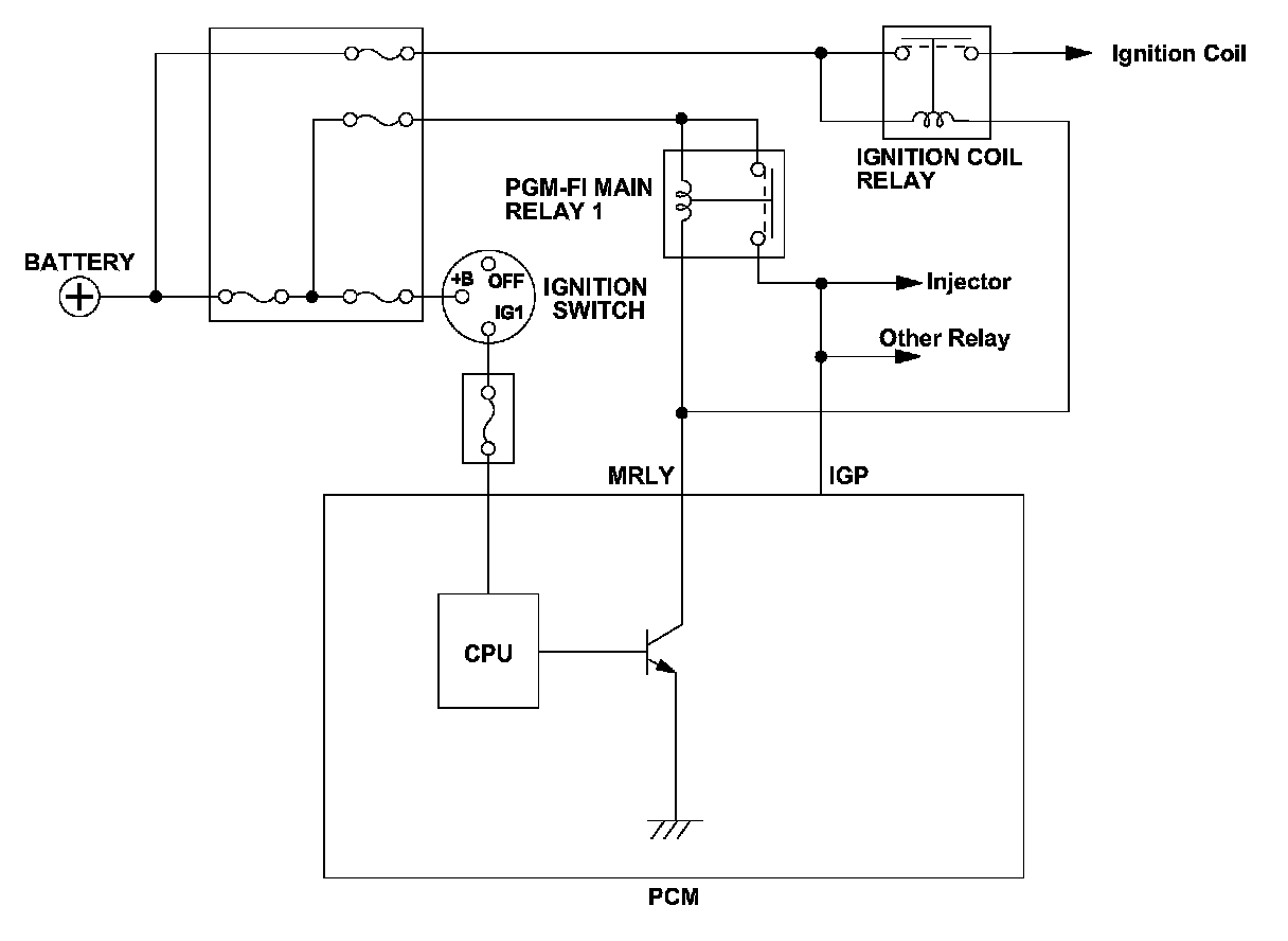 After the ignition switch is turned to LOCK (0), the powertrain control module (PCM) does not shut down immediately. After finishing a predetermined process according to the request of each device and system, the power supply is automatically disconnected (self shut-down function). The PCM power is disconnected by controlling PGM-FI main relay 1. During a normal PCM shut down, the shut down process is executed by the CPU, PGM-FI main relay 1 is turned off, and the voltage to the PCM is turned off to shut down the PCM. When the voltage to the PCM is turned off and the PCM shuts down without the normal shut down procedure, the PCM detects a malfunction in the PGM-FI main relay 1 control circuit and stores a DTC.