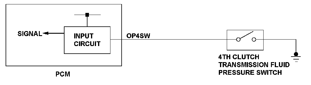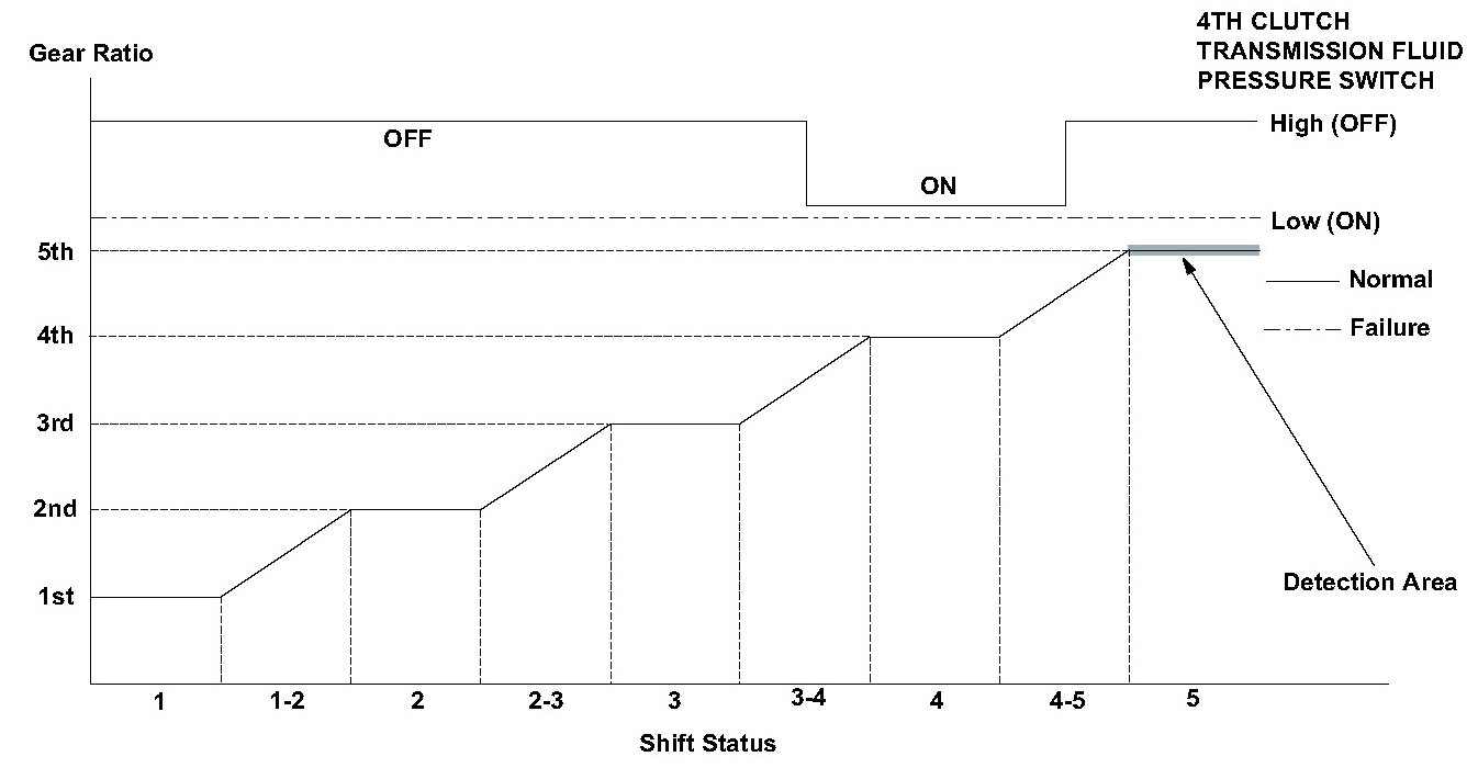 The 4th clutch transmission fluid pressure switch is installed in the hydraulic pressure circuit to the 4th clutch. When hydraulic pressure is supplied to the 4th clutch, the switch is turned ON. When hydraulic pressure is not supplied to the 4th clutch, the switch is turned OFF. The signal from the 4th clutch transmission fluid pressure switch is input to the powertrain control module (PCM). The PCM detects the hydraulic pressure supply conditions at the gear change to 4th gear (3rd --> 4th, 5th --> 4th) to reduce the shock that occurs at the gear change. If the 4th clutch transmission fluid pressure switch is ON while driving the vehicle with the rotation speed ratio of the input/output pulses is other than 4th gear (the ratio is Neutral or 5th), the PCM detects a 4th clutch transmission fluid pressure switch failure and stores a DTC.