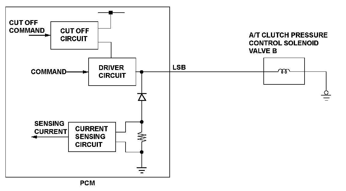 A/T clutch pressure control solenoid valve B is used for clutch pressure control. A spool in A/T clutch pressure control solenoid valve B pushes the valve according to the duty cycle that is controlled by the powertrain control module (PCM) (The hydraulic pressure is proportional to the current). The PCM measures the current flowing through A/T clutch pressure control solenoid valve B, and uses feedback control to compensate for the difference between the actual current and the commanded one. If the measured current for the PCM output duty cycle is not within a specified range (circuit short or open), the PCM detects a malfunction and stores a DTC.