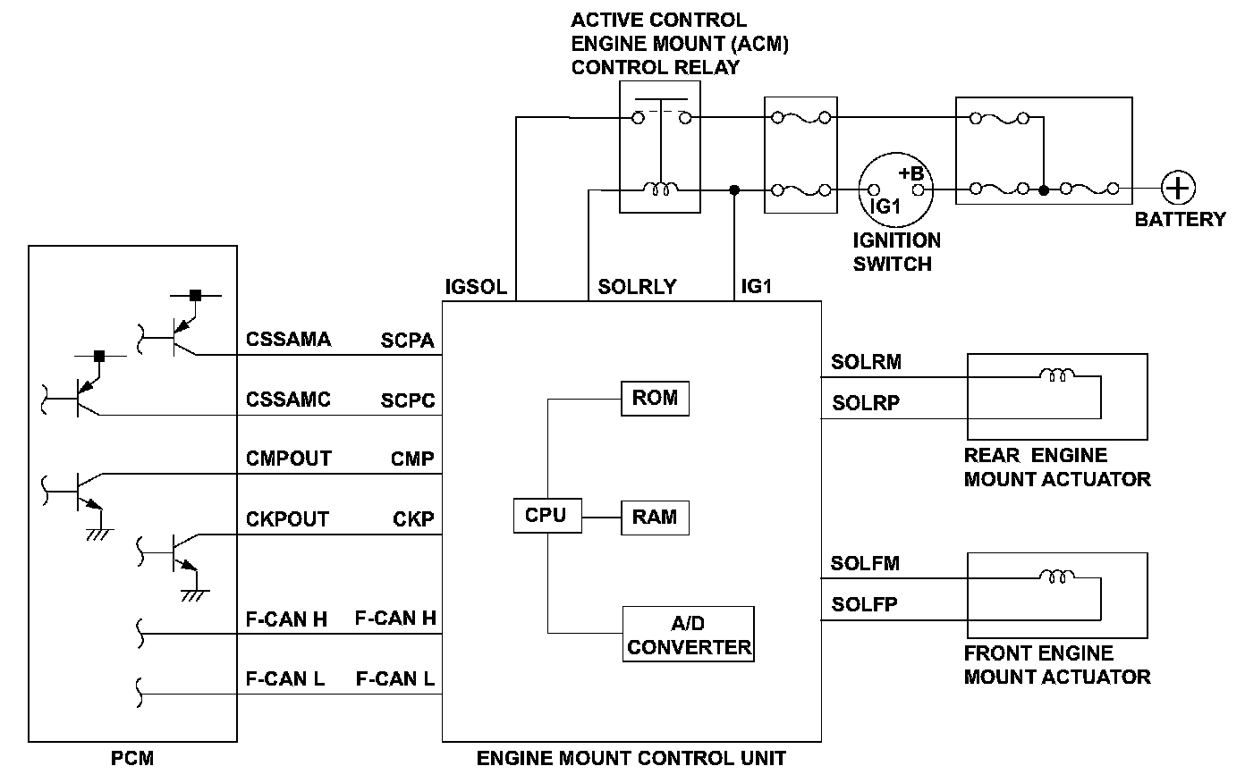 The engine mount control system controls the engine mounts electronically. The system consists of the engine mount actuators, the engine mount control unit, and the powertrain control module (PCM). The engine mount control unit uses the crankshaft and camshaft position sensor outputs (received from the PCM) to estimate engine vibration. The engine mount control unit then sends signals to the engine mount actuators to command the engine mounts to push and pull on the engine to counteract the engine vibration. The engine mount control unit monitors the front engine mount actuator, and when an abnormal condition continues for a set time, the engine mount control unit detects a malfunction and stores a DTC.