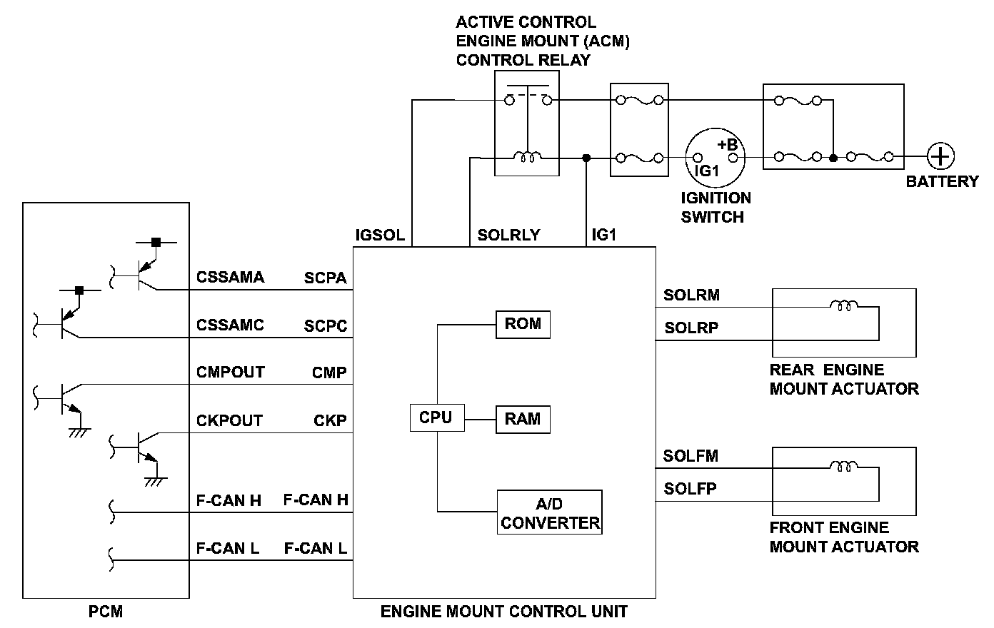The engine mount control system controls the engine mounts electronically. The system consists of the engine mount actuators, the engine mount control unit, and the powertrain control module (PCM). The engine mount control unit uses the crankshaft and camshaft position sensor outputs (received from the PCM) to estimate engine vibration. The engine mount control unit then sends signals to the engine mount actuator to command the engine mounts to push and pull on the engine to counteract the engine vibration. The engine mount control unit monitors the front engine mount actuator, and when an abnormal condition continues for a set time, the engine mount control unit detects a malfunction and stores a DTC.