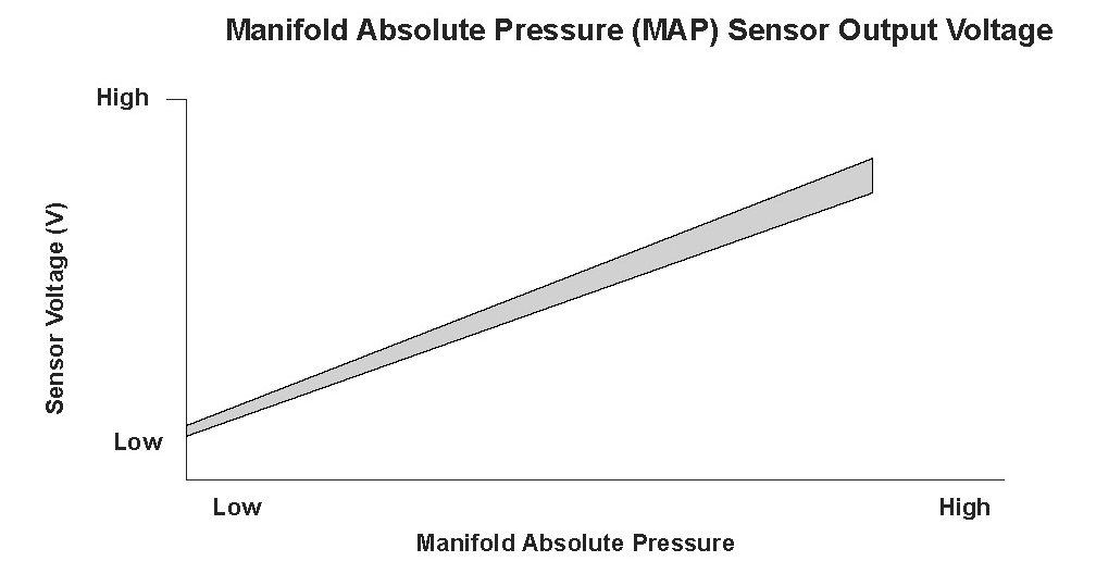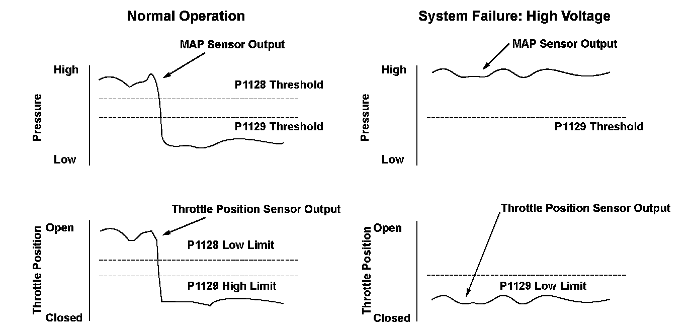 The manifold absolute pressure (MAP) sensor senses manifold absolute pressure (vacuum) and converts it into electrical signals. The MAP sensor outputs low signal voltage at high vacuum (throttle valve closed) and high signal voltage at low vacuum (throttle valve wide open). The powertrain control module (PCM) compares a predetermined MAP value at a given throttle position and manifold absolute pressure to the output voltage value of the MAP sensor. If the MAP sensor outputs high voltage during fuel cut-off operation for deceleration with the throttle valve fully closed, which should make the manifold absolute pressure lower, the PCM detects a malfunction and stores a DTC.