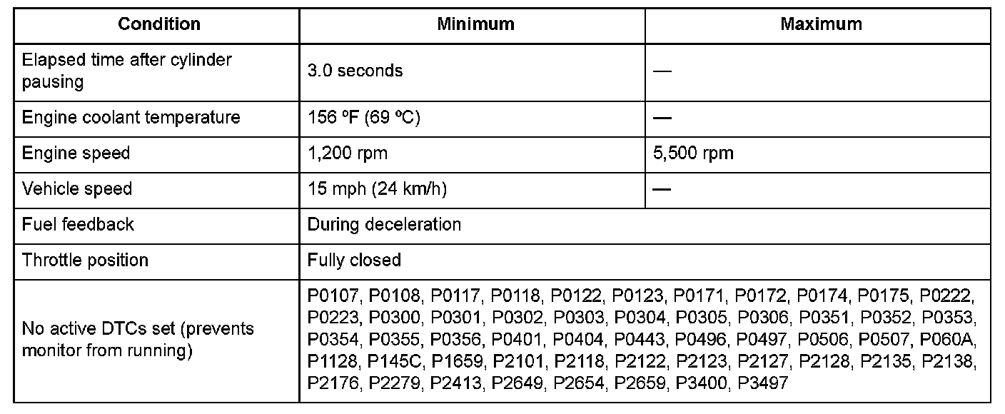 - When 6 cylinder mode (no cylinders are paused), the MAP sensor output is 37 kPa (11.0 inHg, 277 mmHg) or more for at least 2.0 seconds.