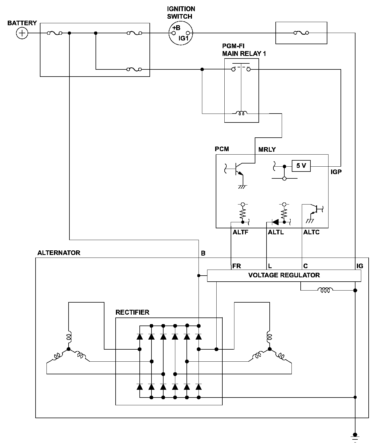 The alternator is driven by the engine, and it generates electricity to supply power to the electrical system and to charge the battery. The alternator voltage target values of 14.5 V and 12.5 V are achieved by switching the alternator control mode (controlled by the powertrain control module (PCM)). The alternator output signal is sent to the PCM, and it varies according to the battery's state of charge, the electrical load, and the engine speed. When the IGP terminal voltage is a set value for a set time, the PCM detects a malfunction and stores a DTC.