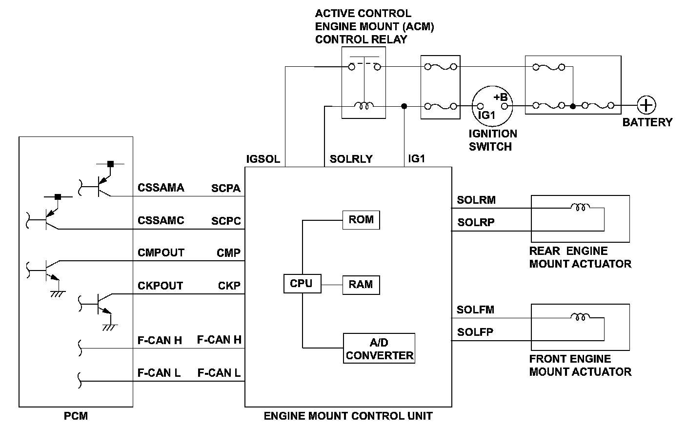 The engine mount control system controls the engine mounts electronically. The system consists of the engine mount actuators, the engine mount control unit, and the powertrain control module (PCM). The engine mount control unit uses the crankshaft and camshaft position sensor outputs (received from the PCM) to estimate engine vibration. The engine mount control unit then sends signals to the engine mount actuators to command the engine mounts to push and pull on the engine to counteract the engine vibration. The engine mount control unit monitors the SCPA signal. If the SCPA signal input value differs from the PCM output value (received by CAN communication) for a set time, the engine mount control unit detects a malfunction and stores a DTC. .