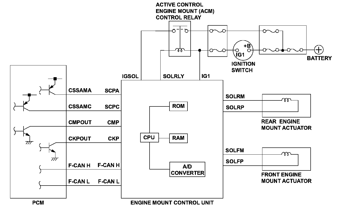 The engine mount control system controls the engine mounts electronically. The system consists of the engine mount actuators, the engine mount control unit, and the powertrain control module (PCM). The engine mount control unit uses the crankshaft and camshaft position sensor outputs (received from the PCM) to estimate engine vibration. The engine mount control unit then sends signals to the engine mount actuators to command the engine mounts to push and pull on the engine to counteract the engine vibration. The engine mount control unit monitors the CMP signal input to the engine mount control unit. If the CMP signal is not input to the engine mount control unit for a set time, the engine mount control unit detects a malfunction and stores a DTC.