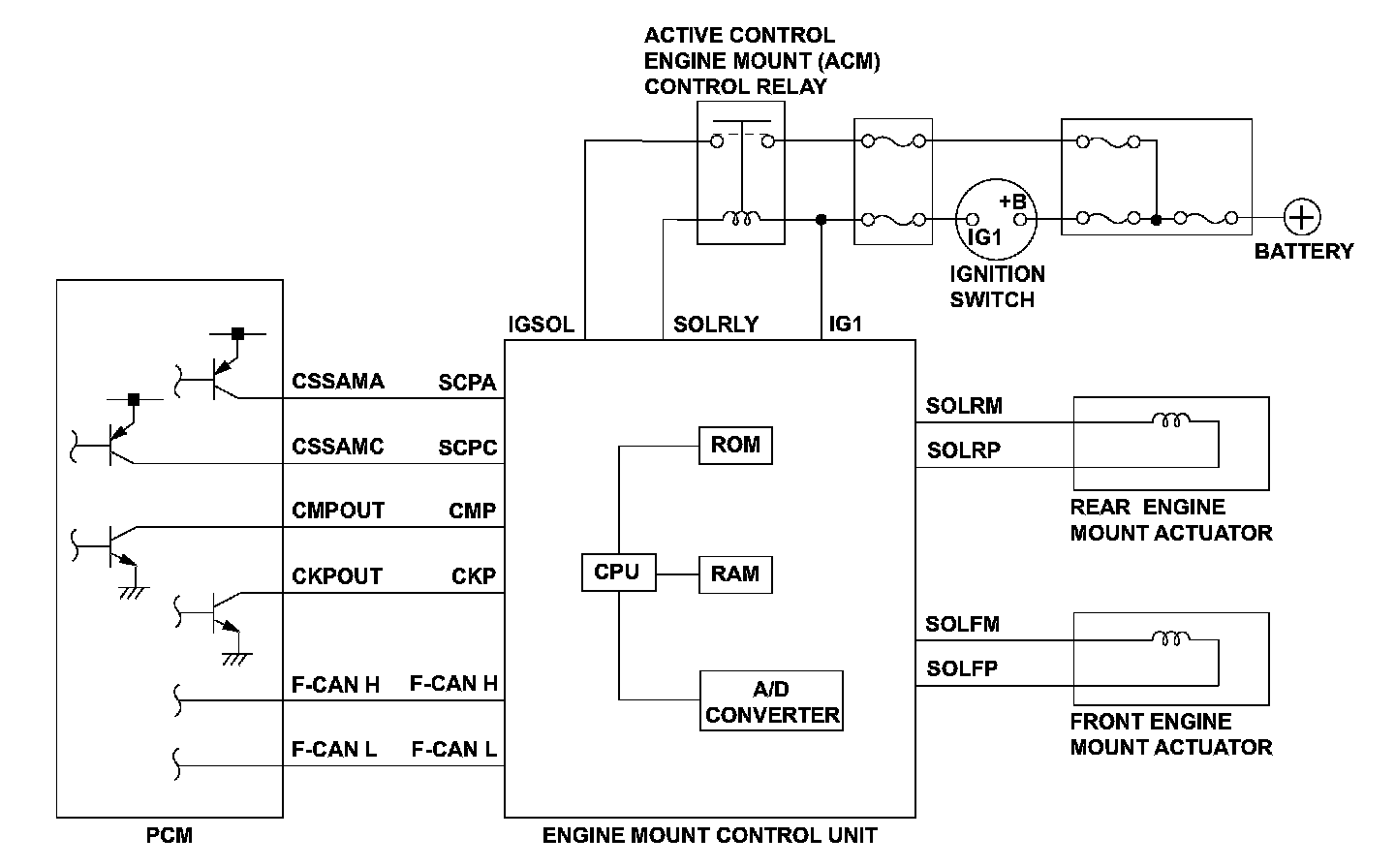 The engine mount control system controls the engine mounts electronically. The system consists of the engine mount actuators, the engine mount control unit, and the powertrain control module (PCM). The engine mount control unit uses the crankshaft and camshaft position sensor outputs (received from the PCM) to estimate engine vibration. The engine mount control unit then sends signals to the engine mount actuators to command the engine mounts to push and pull on the engine to counteract the engine vibration. The engine mount control unit monitors the engine mount control unit power voltage. If the IGSOL voltage is set value for a set time, the engine mount control unit detects a malfunction and stores a DTC.