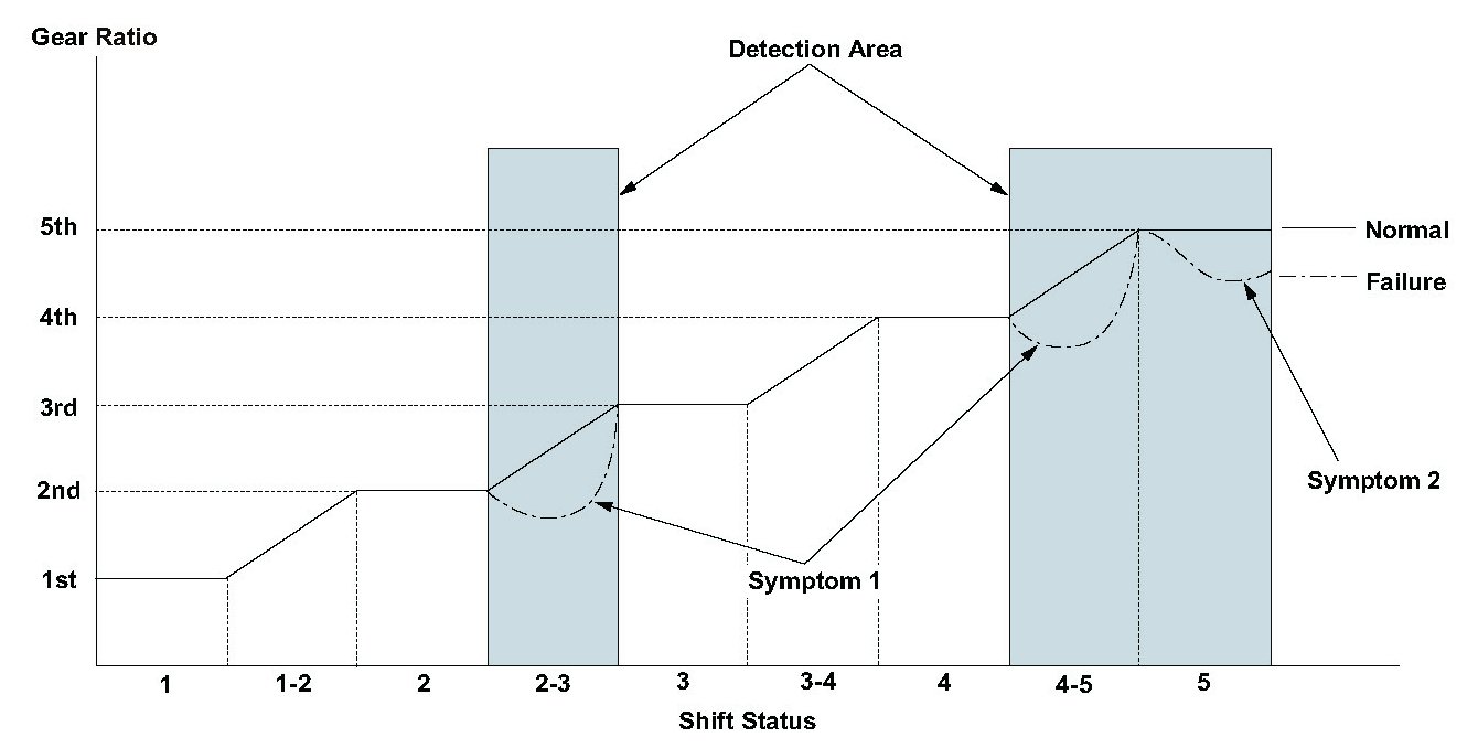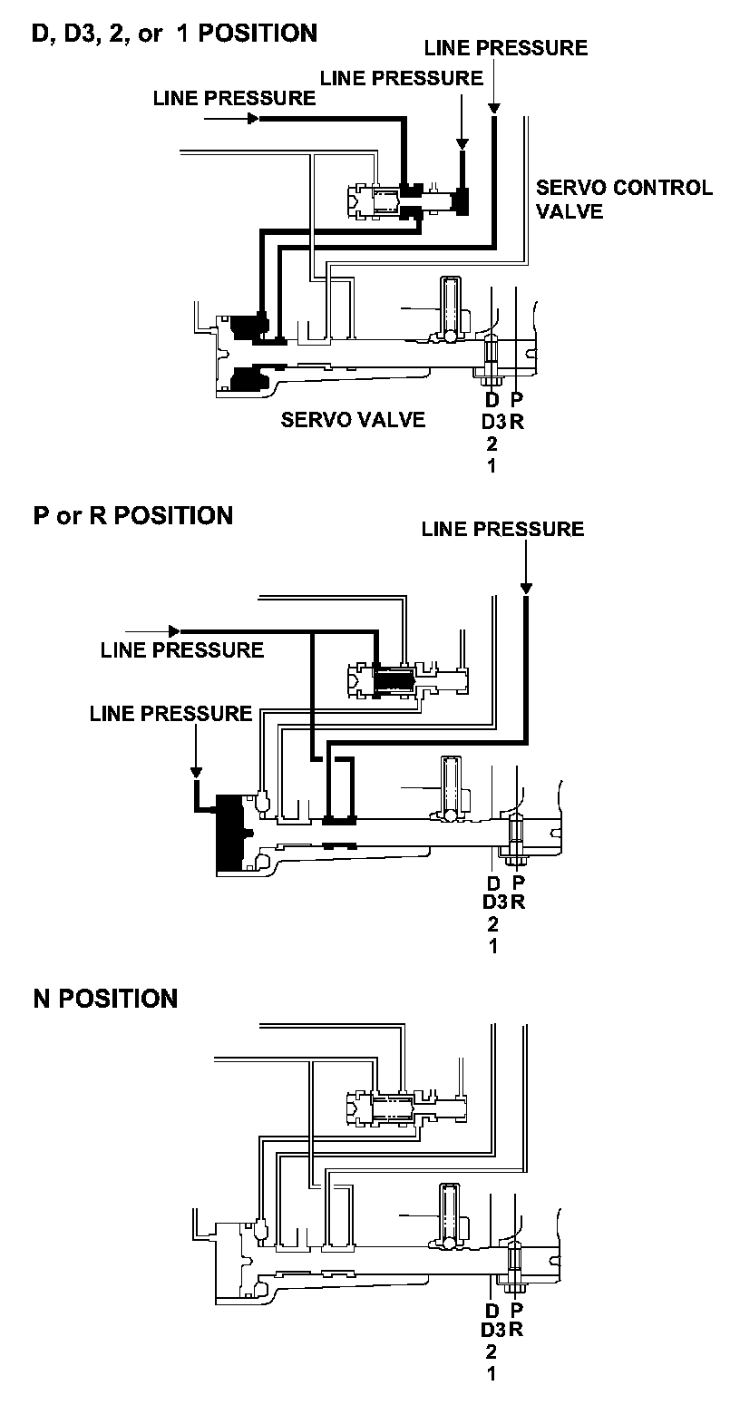 The servo control valve and the servo valve are part of the control circuit of the transmission. The valves operate when the shift lever is in D, D3, 2, or 1 due to line pressure, and they turn off when the shift lever is in P, R, or N. The powertrain control module (PCM) monitors the input shaft (mainshaft) speed and the output shaft (countershaft) speed at the gear change determined by the shift schedule. When an improper gear ratio output is compared to the predetermined gear change mode, the PCM detects a servo control valve OFF or servo valve OFF failure and stores a DTC.