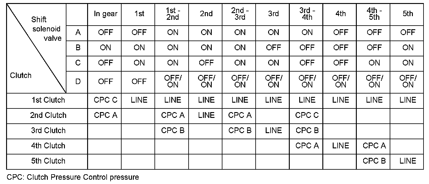 Advanced Diagnostics - DTC P1745: Problem in Shift Control System; Servo Control Valve Stuck OFF or Servo Valve Stuck OFFHydraulic pressure supply to the clutch by shift solenoid valve output (D position)