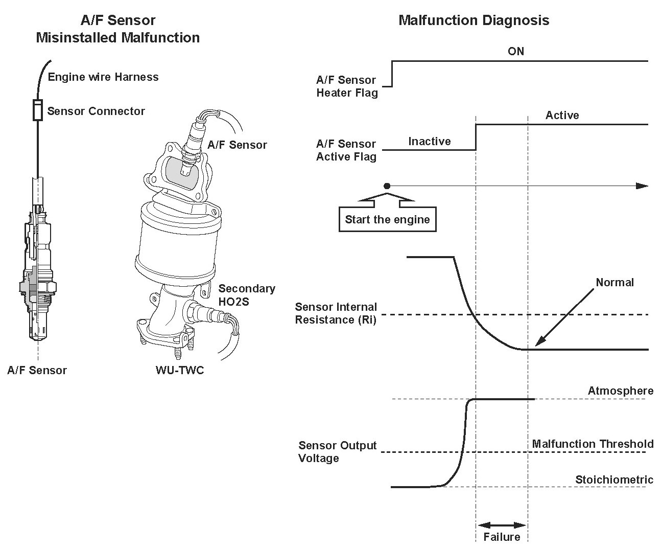 When the rear air/fuel ratio (A/F) sensor (bank 1, sensor 1) is properly connected to the engine wire harness, but it is not installed in the exhaust pipe, the feedback is not done properly even if the rear A/F sensor is active after starting the engine. Thus, the exhaust emissions increase. When the rear A/F sensor output stays out of the normal range after the rear A/F sensor becomes active, the powertrain control module (PCM) detects that the rear A/F sensor is not properly installed and stores a DTC.