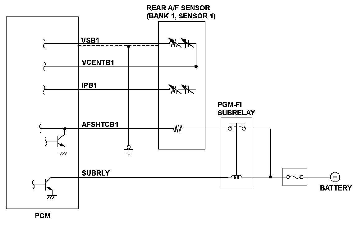 The rear air/fuel ratio (A/F) sensor (bank 1, sensor 1) is installed in the exhaust manifold and detects oxygen content in the exhaust gas. The rear A/F sensor transmits a signal to the powertrain control module (PCM), and it enables overall feedback control. The PCM controls fuel injection duration by comparing the target air/fuel ratio with the rear A/F sensor signal. When the self diagnosis function in the PCM detects a short circuit failure, it measures the PCM input voltage of the VSB1/ VCENTB1/IPB1. If the IPB1 terminal voltage is less than VSB1/VCENTB1 terminal voltage, the PCM detects a malfunction and stores a DTC.