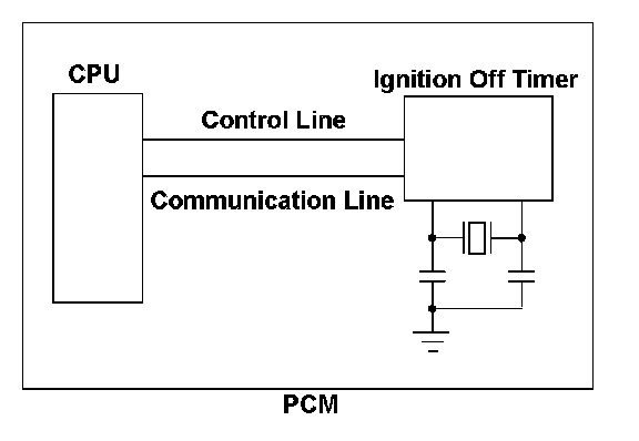 The powertrain control module (PCM) has a built-in ignition off timer that measures the duration of time from ignition off to the next ignition on. The measured duration is used for evaporative emission (EVAP) leak detection and temperature assumption of the catalytic converter. The CPU in the PCM accesses the ignition off timer when reading the measured duration. If the access process fails, a malfunction is detected and a DTC is stored. When an abnormality is found in the read data, the PCM detects a malfunction and stores a DTC.
