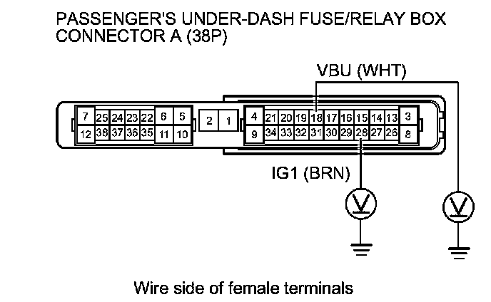 6. Measure the voltage between body ground and passenger's under-dash fuse/relay box connector A (38P) terminals No. 18 and No. 28 individually.