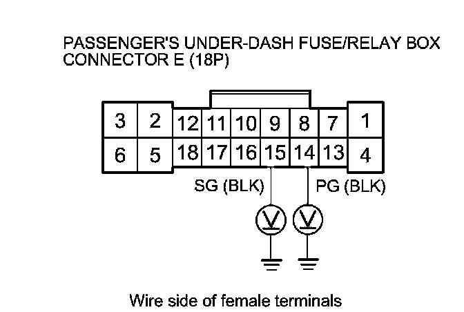 9. Measure the voltage between body ground and passenger's under-dash fuse/relay box connector A (38P) and E (18P) terminals as shown.