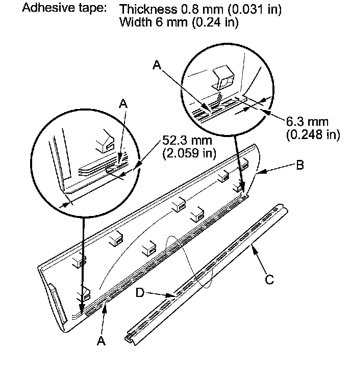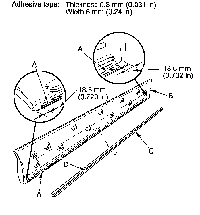 4. Apply PP primer (A) to the area of the door lower trim (B) where the new door side sill lower seal (C) will be applied. Attach the seal with the double-sided adhesive tape (D) to the trim, then push on the adhesive area to make the adhesive stick securely.