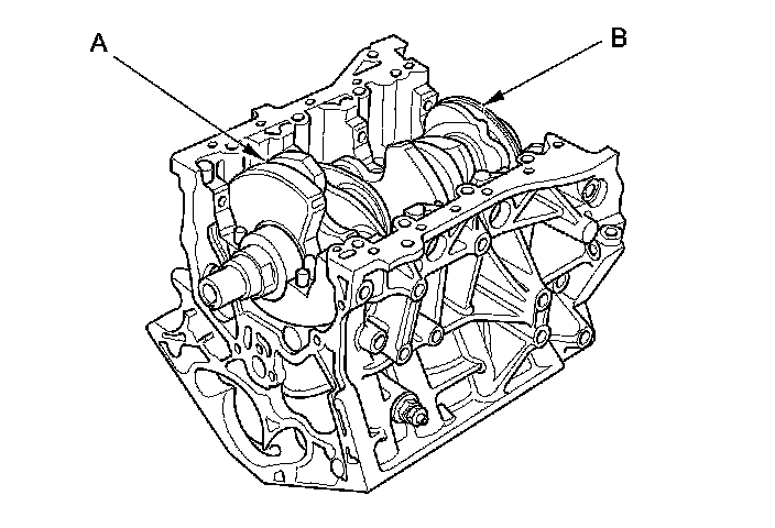 6. Lower the crankshaft (A) into the engine block, being careful not to damage the journals and the CKP pulse plate (B).