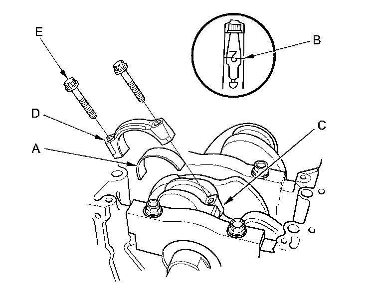 9. Apply new engine oil to the bolt threads and flanges, then loosely install the bearing cap bolts (D) and the bearing cap side bolts (E).