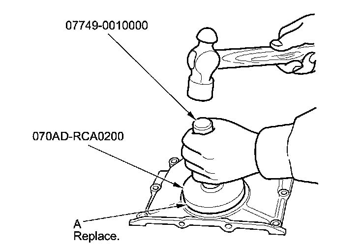 26. Using the driver handle, 15 x 135L and the oil seal driver attachment, 106 mm, drive in the new crankshaft oil seal (A) until the oil seal driver attachment bottoms on the engine block end cover.