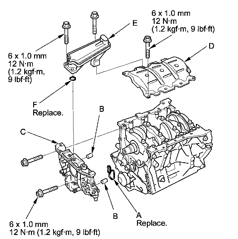 37. Install the baffle plate (D), then install the oil strainer (E) with a new O-ring (F).