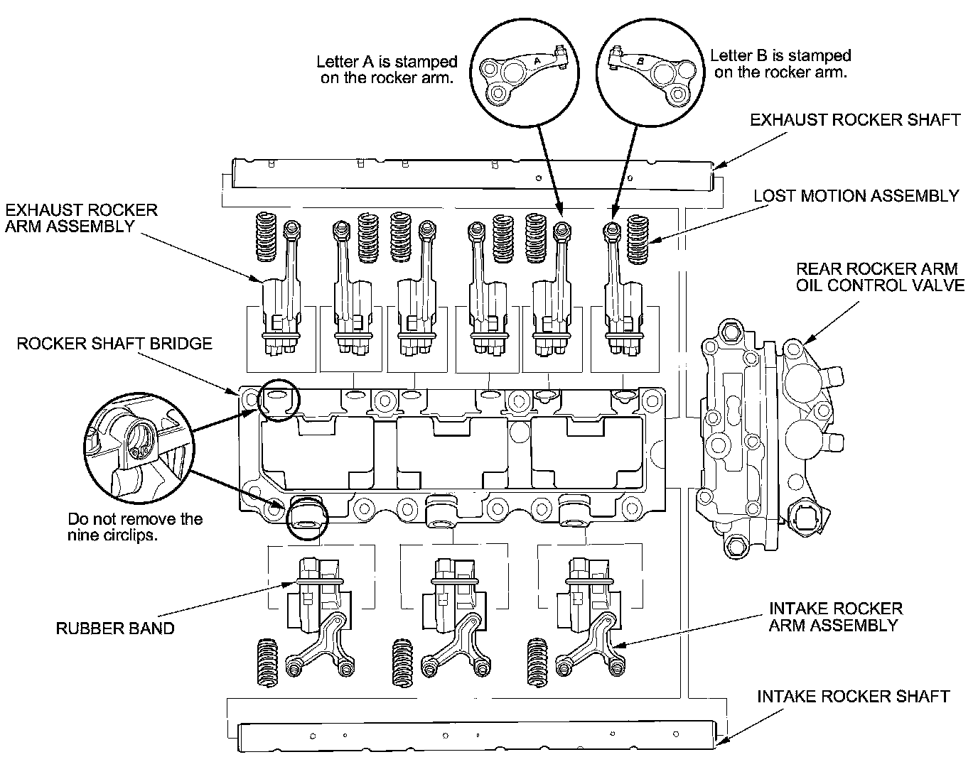 - Never remove any of the circlips that retain the lost motion assemblies in the rocker shaft bridge. The circlips are not available separately, and are factory installed in the rocker shaft bridge. To remove the lost motion assemblies, first remove the rocker shafts and the rocker arms.