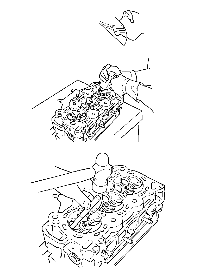 5. Working from the camshaft side, use the driver and an air hammer to drive the guide about 2 mm (0.08 in) towards the combustion chamber. This will knock off some of the carbon and make removal easier. Hold the air hammer directly in line with the valve guide to prevent damaging the driver. Wear safety goggles or a face shield.