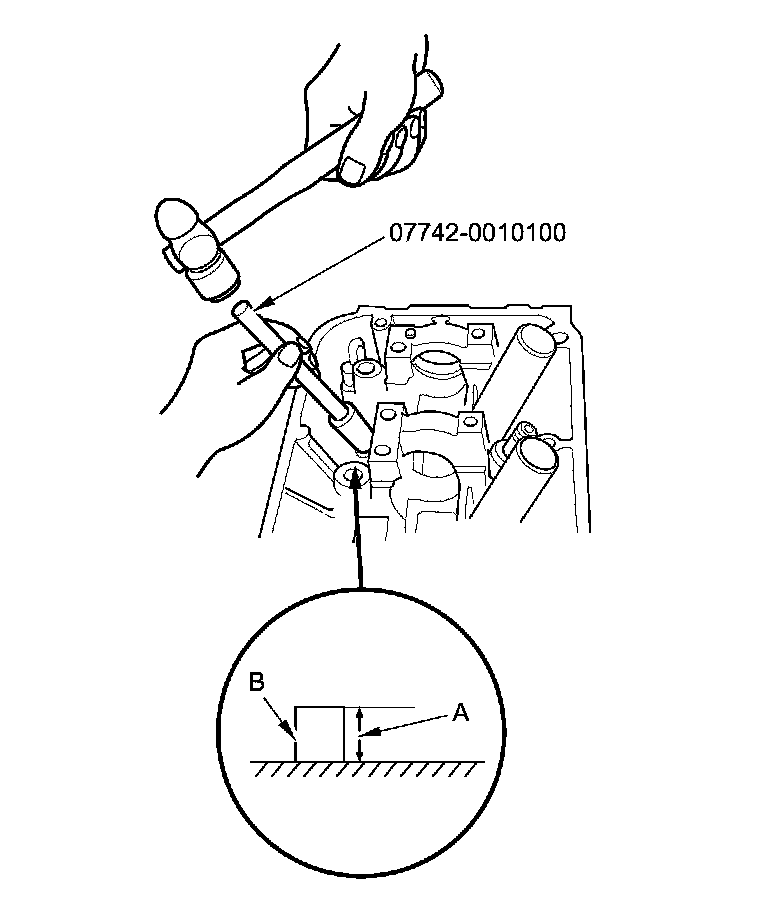 9. Apply a thin coat of new engine oil to the outside of the new valve guide. Install the guide from the camshaft side of the head; use the valve guide driver, 5.35 x 9.7 mm to drive the guide to the specified installed height (A) of the guide (B). If you have all 12 guides to do, you may have to reheat the head.