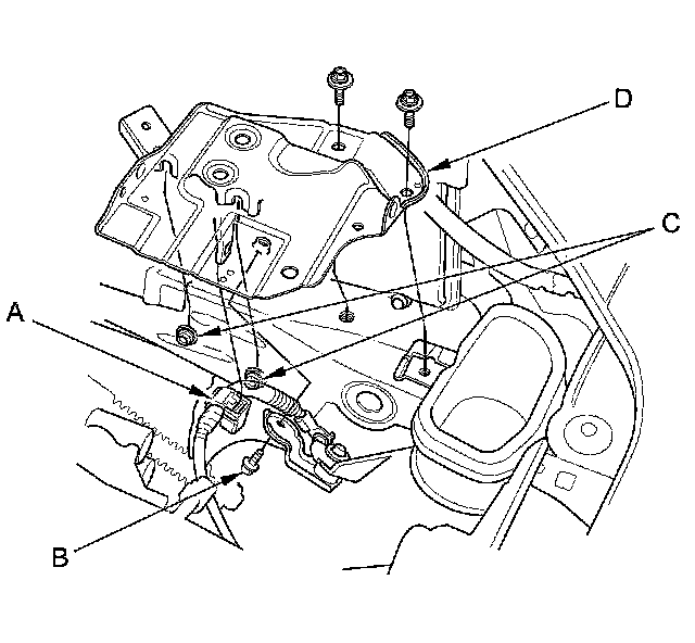 49. Remove the front engine mount stop (A), then remove the front engine mount bolt (B) and disconnect the engine mount actuator connector (C), and remove the connector (D) from the front subframe.