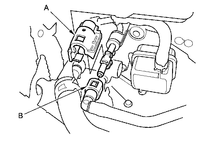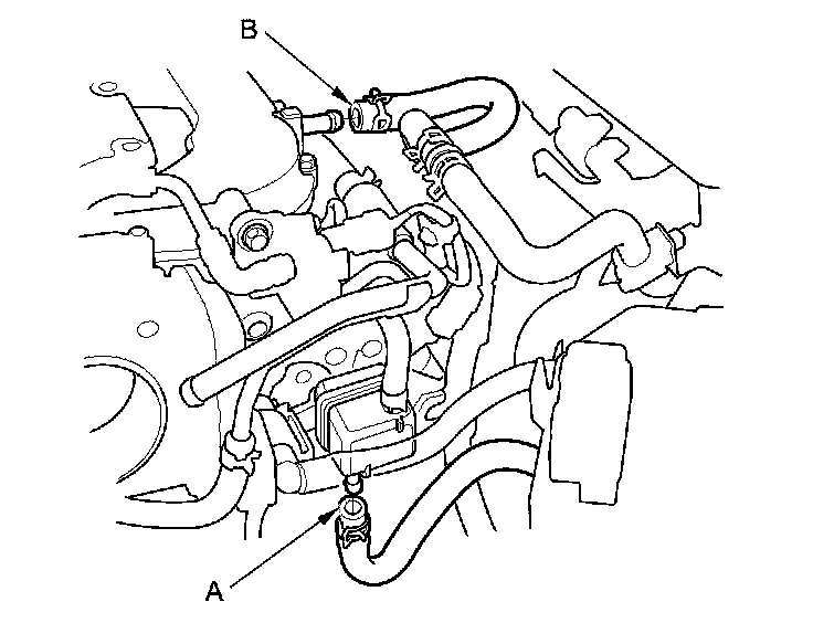 16. Disconnect the EVAP canister hose (A) and the brake booster vacuum hose (B).