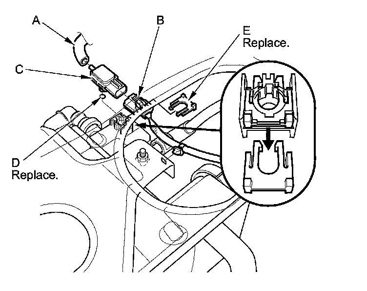 5. Install the parts in the reverse order of removal with a new O-ring (D) and a new retainer (E).