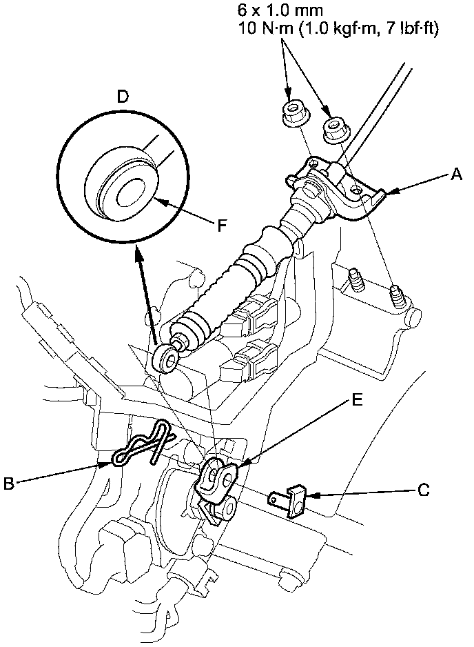 6. Check the bushing (F) in the shift cable end for proper fit and wear. If the bushing is loose or worn, replace the shift cable.