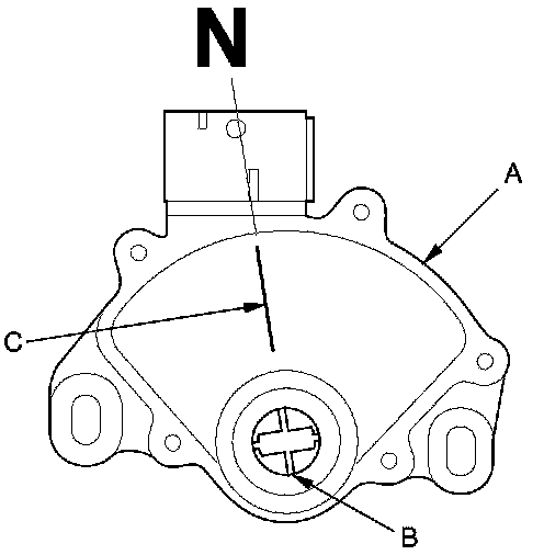 12. Set a new transmission range switch (A) to the N position. The transmission range switch clicks in the N position, and the selector control shaft hole (B) aligns with the N position line (C).