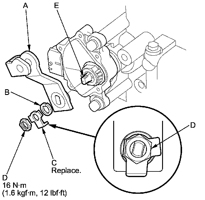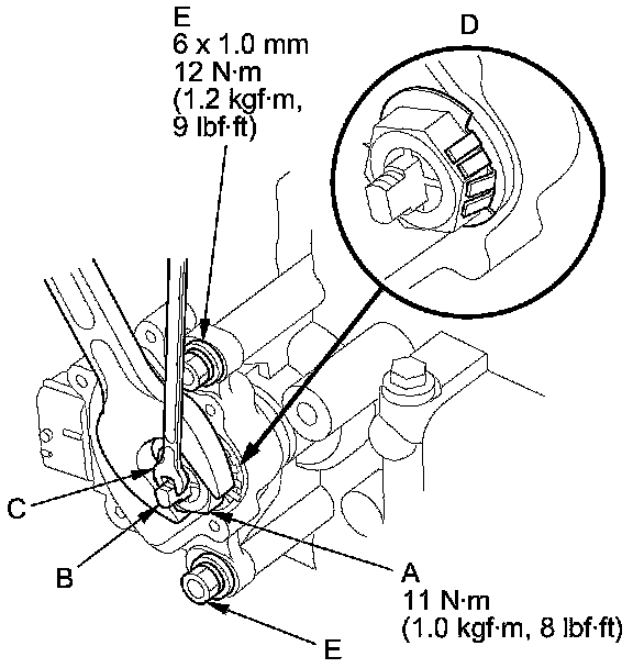 15. Push the locknut against the transmission housing to seat the transmission range switch into the selector control shaft, and tighten the locknut (A) to 11 Nm (1.0 kg-m, 8 lb-ft) while holding the selector control shaft (B) with a 6.0 mm wrench (C), then bend the lock tabs (D) of the lock washer against the locknut.